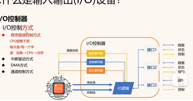 io 直接控制就是 cpu 直接控制 io 设备,这样的话 cpu 就会一直等待 io 设备的响应,会一直查看状态寄存器,然后后面从数据寄存器中读取数据,这样的话 cpu 就会一直等待,浪费时间