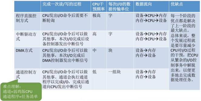 通道控制方式就是,io 设备直接访问内存,不需要 cpu 参与,但是这个时候 cpu 不能去干别的事情,因为这个时候 cpu 还是要控制通道的,通道就是一个专门的硬件,专门用来控制 io 设备的,这个时候 cpu 就会去控制通道,然后通道去控制 io 设备,这样的话 cpu 就不会浪费时间了
