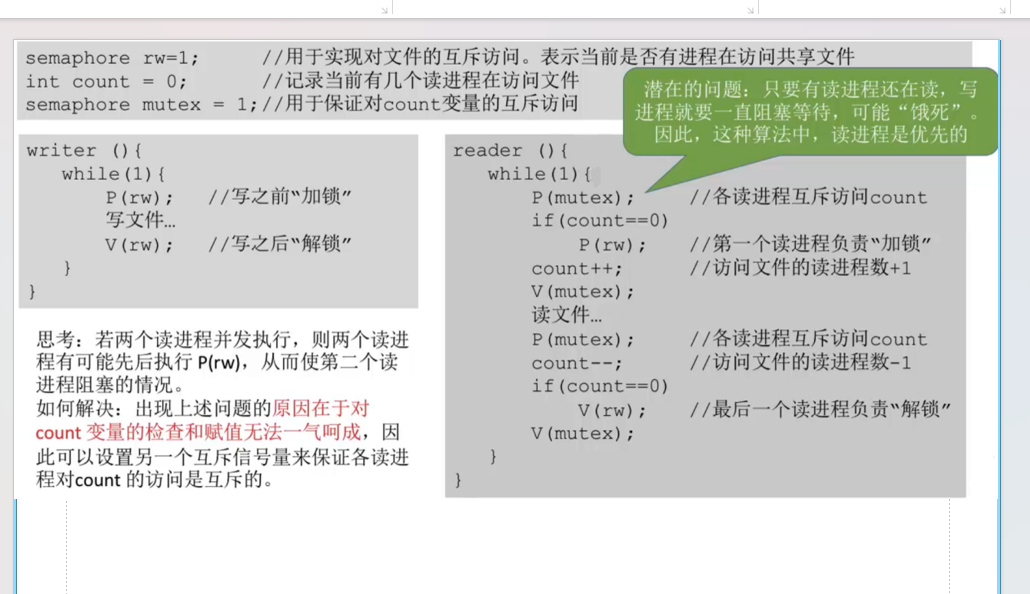 先看读者,第一个读者开读,然后互斥信号量--,这个互斥是为了让count的+能保证互斥,不然如果同时两个读者并发执行的话,有可能count的值会同时+1,这样就会导致读到错误的数据,所以要加一个互斥信号量,然后count++