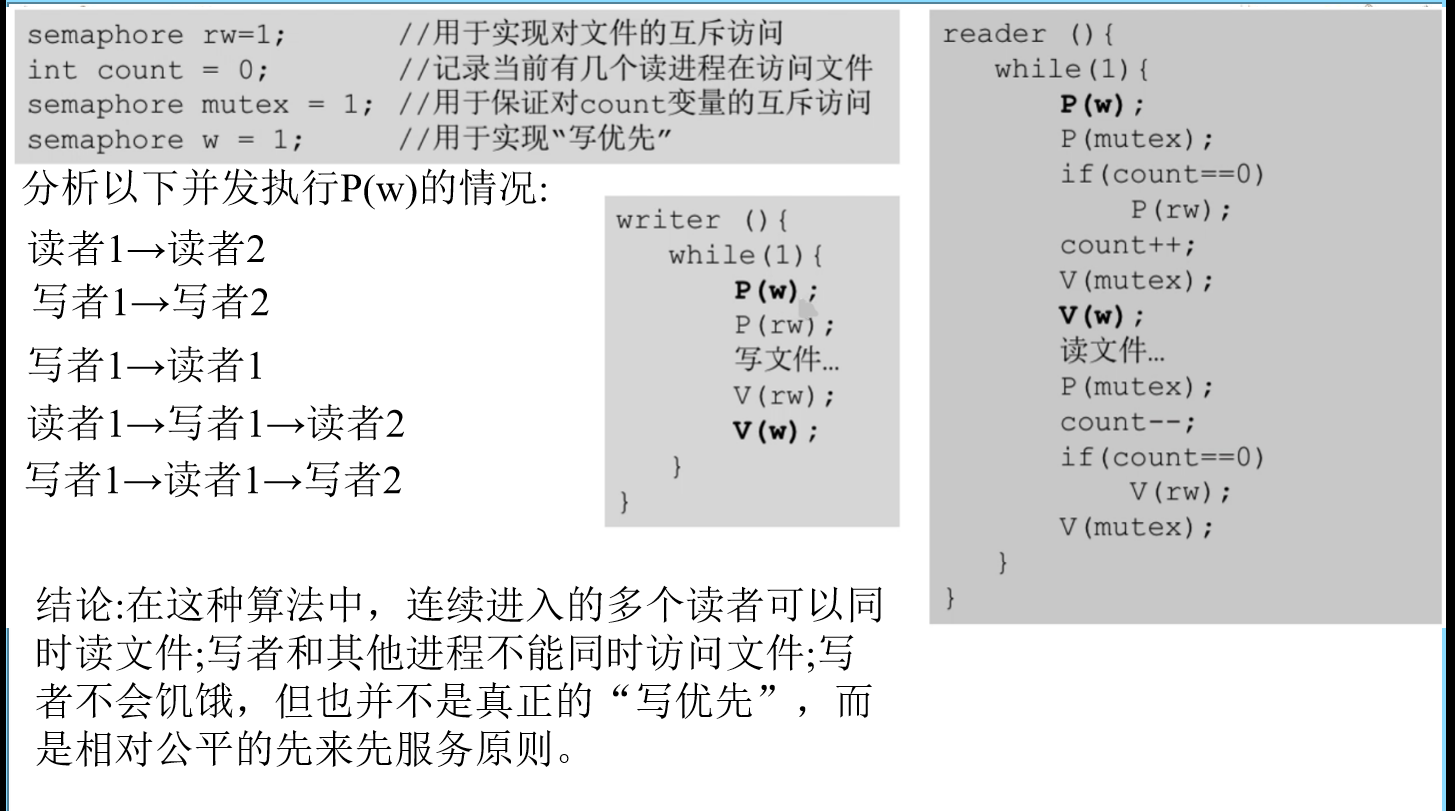 第一个读者进去,pw能行,pmutex能行,完了+了以后,上锁了,锁完不能写了,然后继续,后面都能执行