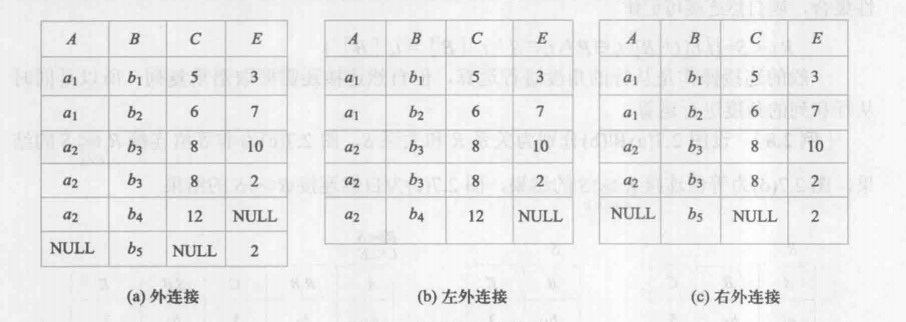 外连接就是,自然连接其实是会筛除掉没有匹配的项,但是外连接就不会,会把没有匹配的项也显示出来,然后用 null 来填充