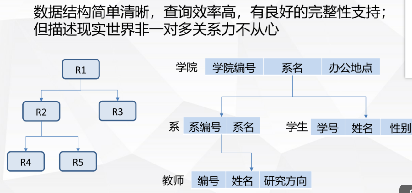 层次模型是一种树形结构,数据之间的关系是一对多,比如说,一个学院,学院对应院系,学院对应专业,然后院系又可以对应老师,学生