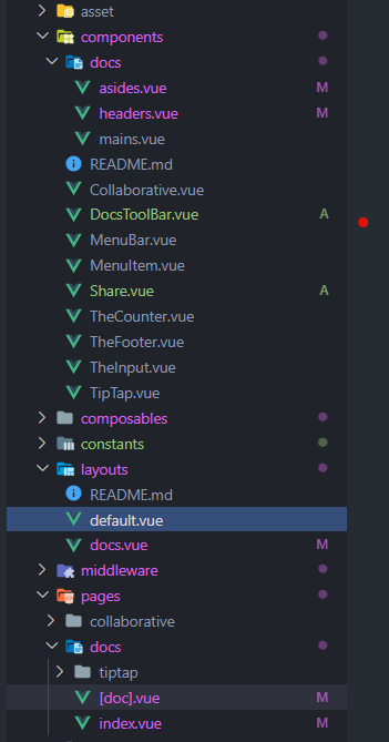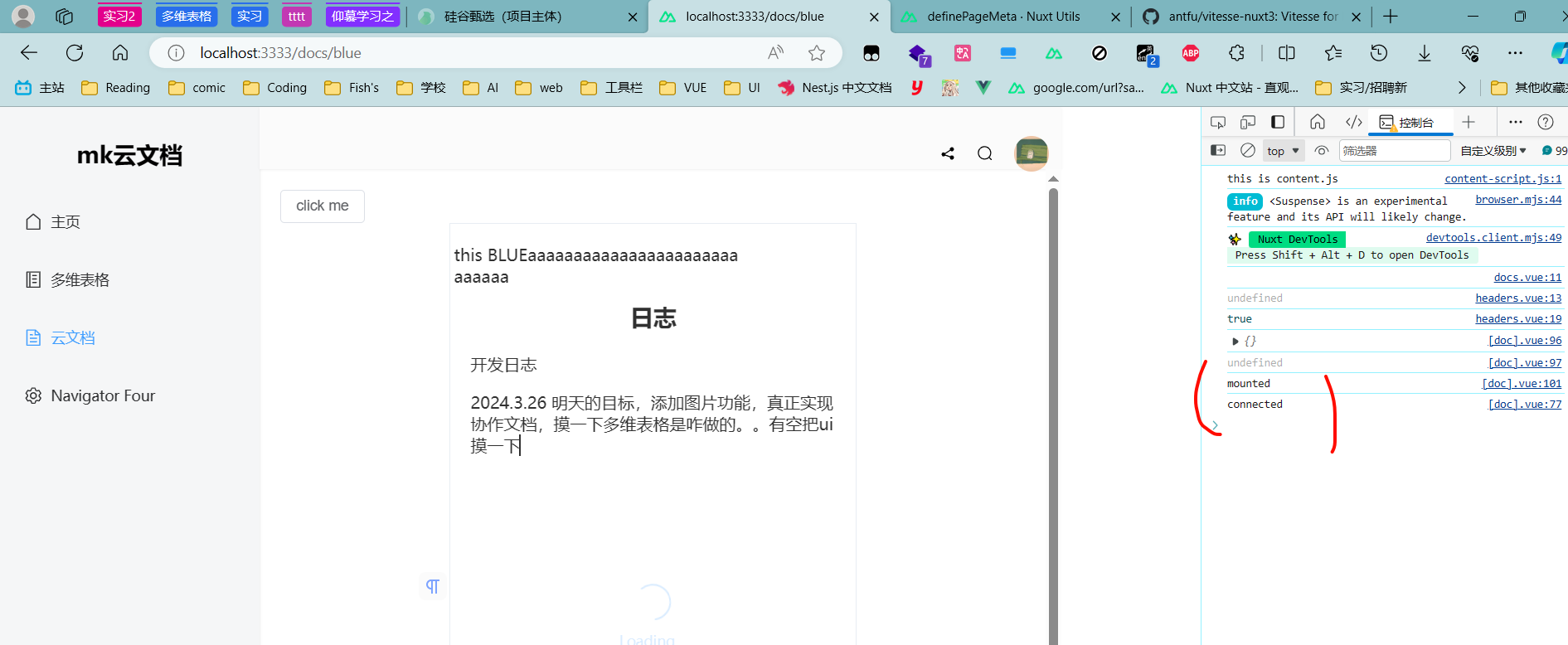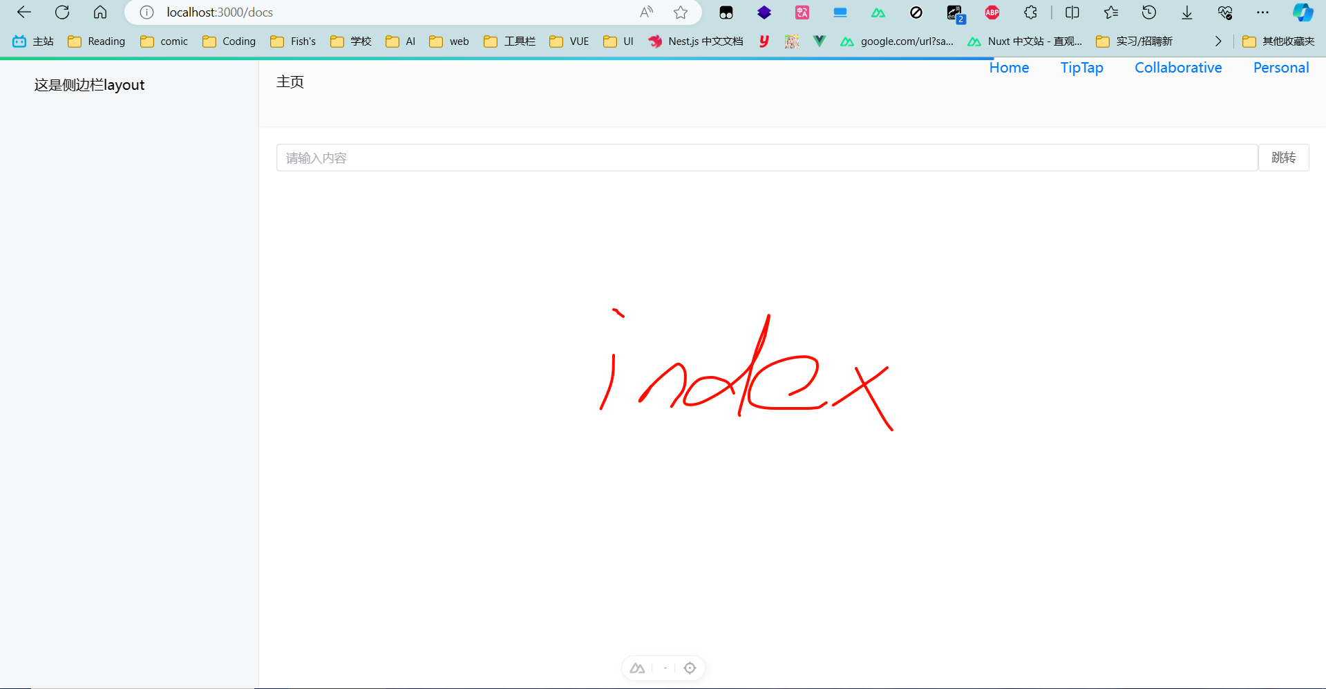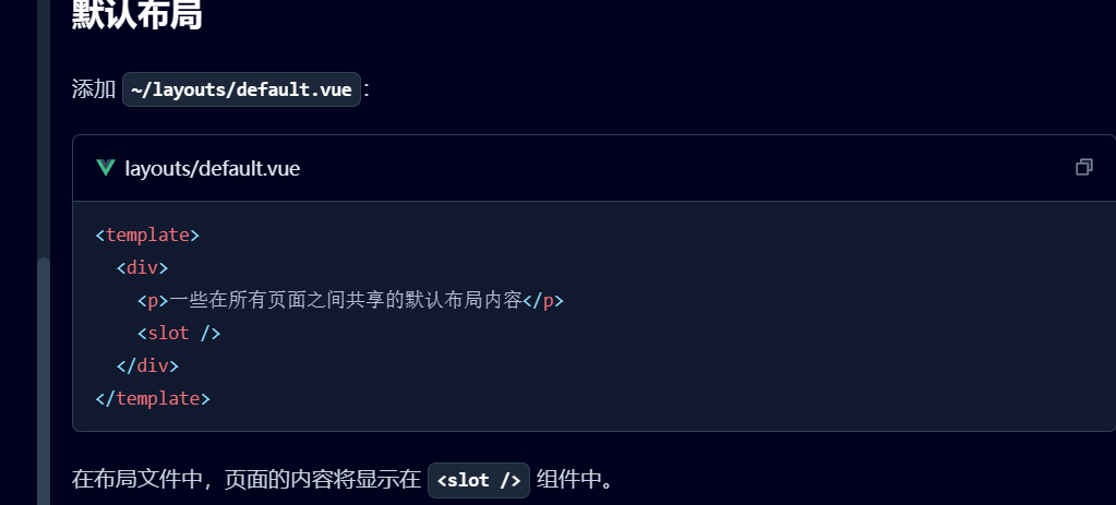 我的 main docs 子路由出口是用了原本我们在 vue3 中常用的,用 routerview 然后 component 渲染的方式,但是在 nuxt 中,他的 layout 是用 slot 作为出口的,因为在 app.vue 中已经有了一层 router-view,所以在 layout 中再套了一层相当于嵌套了,经典的不可达